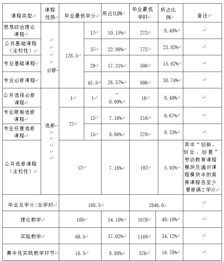 毕业总学分 168.5 学分,其中理论教学 100 学分,实验教学 68.5 学分,集中性实践教学环节 16.5 学分。实验实践教学占总学分 45.94%。