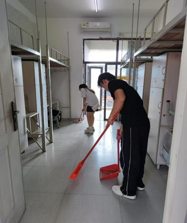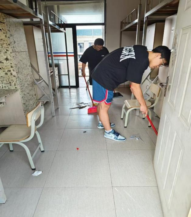 在此次清扫活动中,同学们分工明确,认真细致地进行清理工作。他们在扫帚和抹布的帮助下,清除地板上的灰尘、擦拭桌椅及窗户,去除积累的污渍和杂物。整个清扫过程高效有序,确保每一个宿舍的角落都焕然一新,窗户干净透亮,宿舍环境整洁有序,为新生们营造了一个舒适、温馨的生活空间。