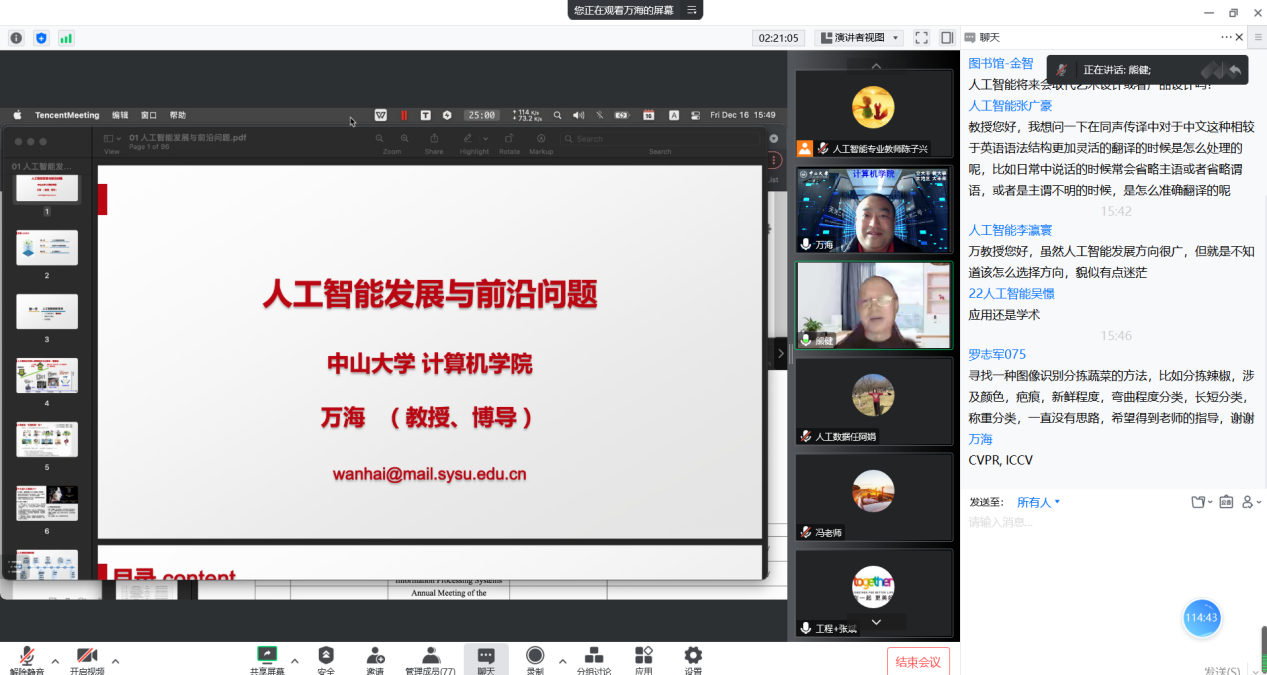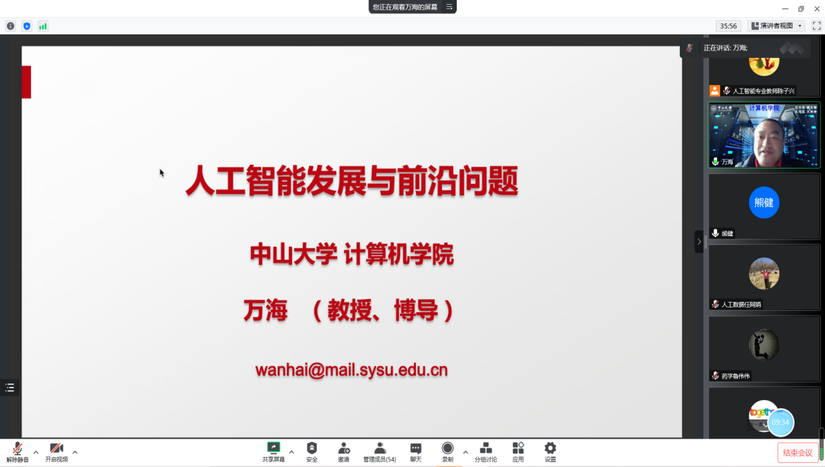 12月16日,我校邀请了中山大学计算机学院教授、博导万海作“人工智能发展与前沿问题”线上学术讲座。我校88名师生参与活动。讲座由太阳集团城网站2017系主任熊健主持。