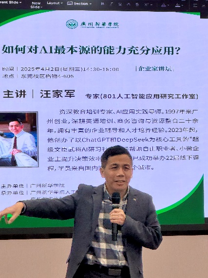 汪家军以“解锁AI本源能力,赋能未来智能世界”为主题,深入浅出地阐述了AI最本源能力的内涵与价值。他以“你未来3年在脑海中最重要的事情(或事物)”为切入点,提出如何利用AI解决生活中重要的事情,让AI为我们的生活赋能。在使用AI时,他特别强调要提前准备提示词,在多轮对话中挖掘AI能力。通过现场生动的案例,如“某同学们未来3年职业规划”、“如何利用AI在数学教学中发挥作用”等,让大家理解与AI对话的过程。汪家军展示了在提前准备提示指令的情况下,让AI本源能力在实际场景中发挥强大作用,让听众对AI的应用有了更加直观的认识。在讲座中,汪家军还特别引用自己或身边发生的使用AI的案例。比如“如何用AI帮忙批改英语作文”、“如何请AI出方案收回欠款”,通过案例的分享,让我们更深的认识AI的本源能力。