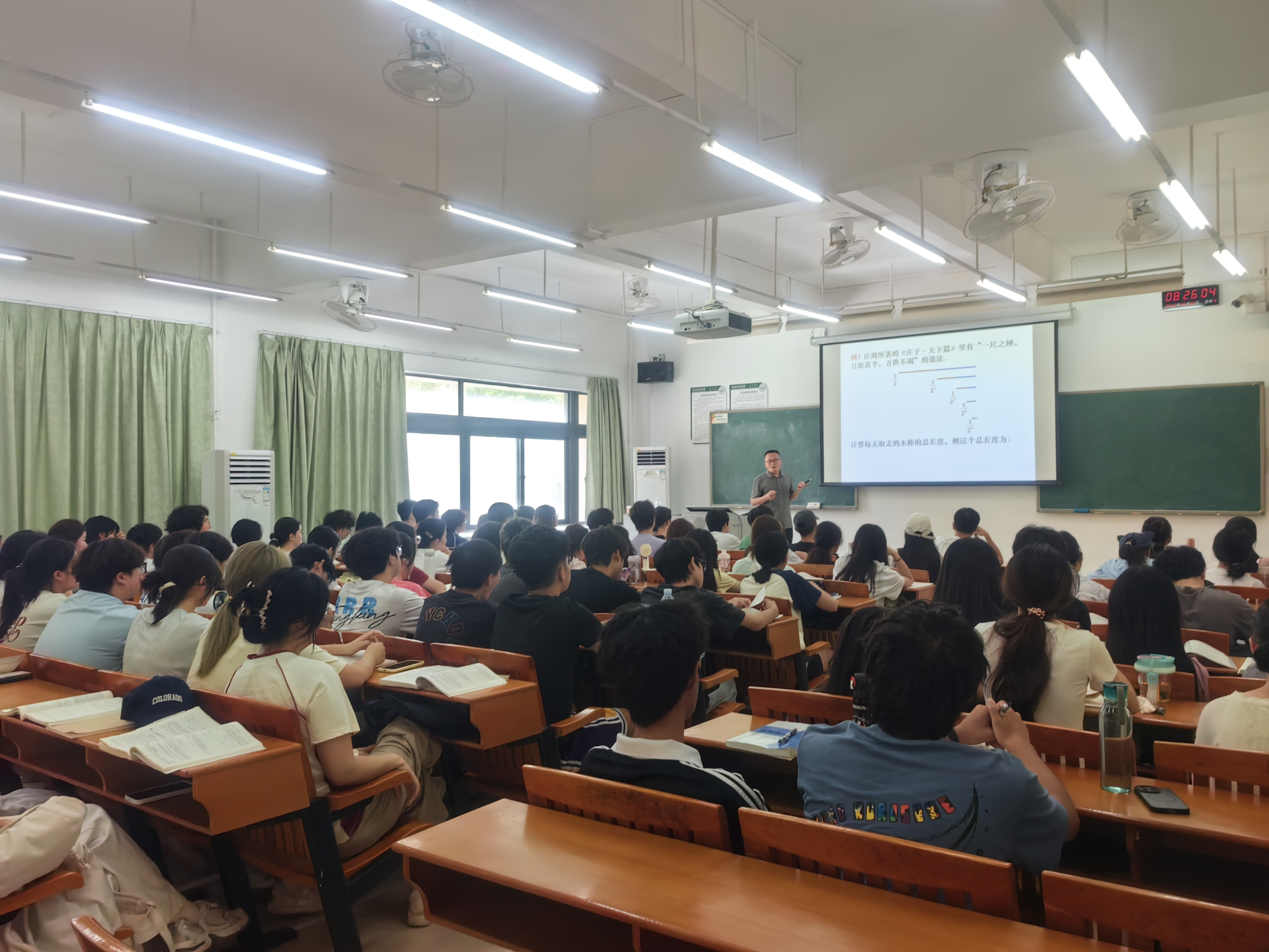 首先,姚副校长走进了李华胜老师的《高等数学(一)》课堂,听取李老师的授课。本节课主要讲授常数项级数的定义及其收敛性的概念与判定方法。课堂伊始,李老师以《庄子·天下篇》中的“一尺之捶,日取其半,万世不竭”,这个古老而富有哲学意味的典故,与1883年德国数学家康托构造的康托点集的例子,引入常数项级数的定义。随后,通过对比常数项级数的部分和序列与无穷级数的关系,自然地引出级数收敛与发散的概念,揭示出级数的收敛与发散本质上与数列极限的存在与否是一致的。在此基础上,归纳出了级数收敛性的判断方法,并通过具体的算例,详细地讲解了级数收敛性的判定流程。最后,通过课堂练习,考察了学生的理解情况,让学生能及时巩固所学知识。