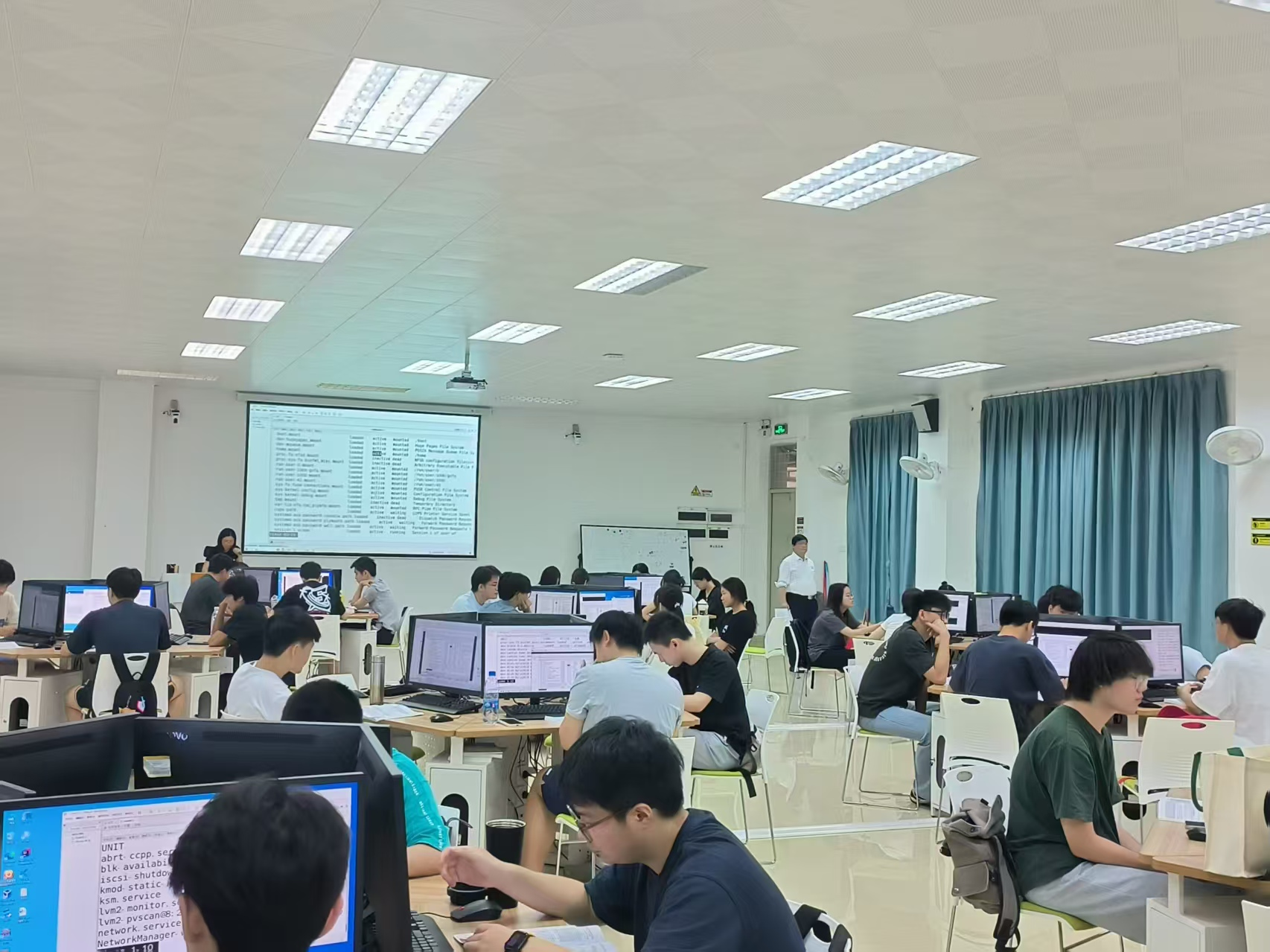 听完李华胜老师的课后,姚副校长继续走进了我系王芬老师的《操作系统》课堂。此次课程是一堂上机实验课,其核心目标是通过实际操作练习,让学生熟练掌握如何运用各类命令查看电脑进程与任务的各种状态,以及如何精准解读运行结果。课堂上,王老师先是依据实验步骤,有条不紊地为学生进行现场演示。在演示过程中,她还不时地向学生抛出问题,引导学生主动思考和观察。演示结束后,便放手让学生自行操作练习。此时,王老师便穿梭在教室中,耐心地为学生解答遇到的各种疑问,悉心指导每一位学生。